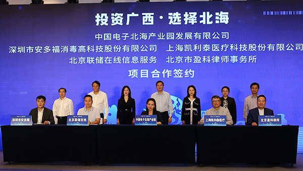 在北海市委書(shū)記蔡錦軍,市委常委、常務(wù)副市長(zhǎng)譚秀洪,市委常委、秘書(shū)長(zhǎng)鄭定雄,經(jīng)開(kāi)區(qū)管委會(huì)主任劉忠廣,中國(guó)電子北海產(chǎn)業(yè)園公司執(zhí)行董事徐俊男,長(zhǎng)江商學(xué)院老師徐汀、長(zhǎng)江商學(xué)院老師許耀公的見(jiàn)證下,中國(guó)電子北海產(chǎn)業(yè)園發(fā)展有限公司與上海凱利泰醫(yī)療科技股份有限公司、北京聯(lián)儲(chǔ)在線信息服務(wù)有限公司、深圳市安多福消毒高科技股份有限公司、北京市盈科律師事務(wù)所簽署合作協(xié)議。
